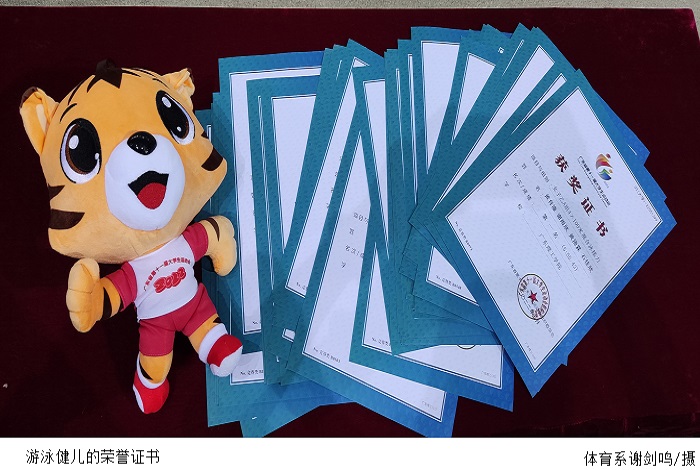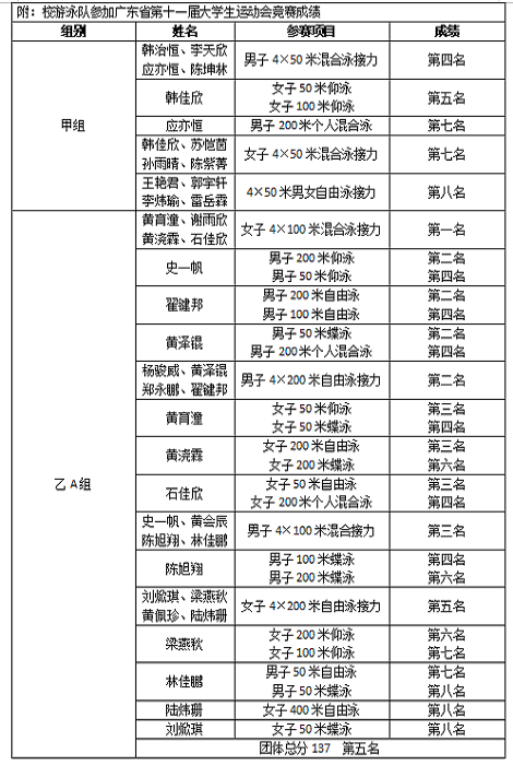 此次比赛公司派出甲、乙组两支游泳队共计30位运动健儿参与。团体项目中,公司体育系社会体育指导与管理专业的黄育潼、谢雨欣、黄浇霖、石佳欣四位同学在重压之下,调整状态、奋力拼搏,最终以5分55秒42的成绩在女子乙A组4×100m混合泳接力赛中突出重围,赶在最后一刻反超对手一举拿下冠军,赢得全场观众的阵阵喝彩。另外,公司学子参与乙A组比赛以137分的优异成绩获团体总分第五名。