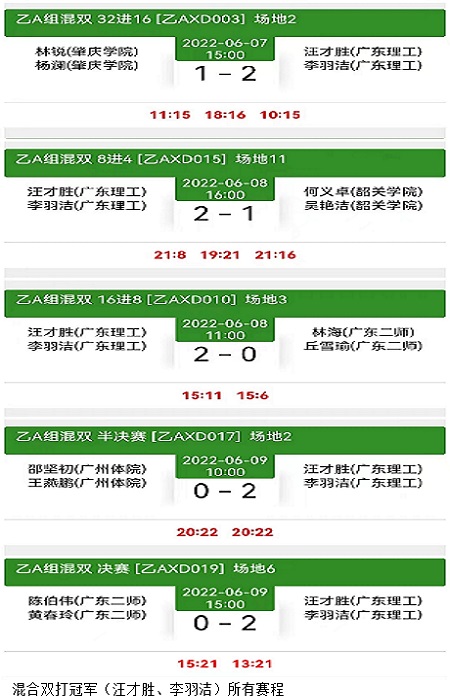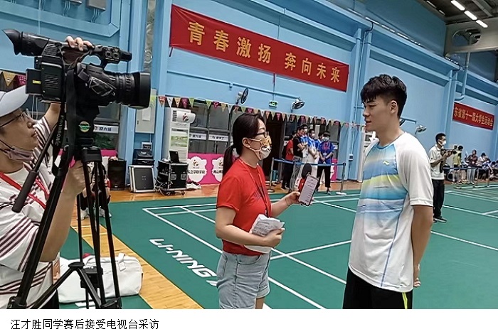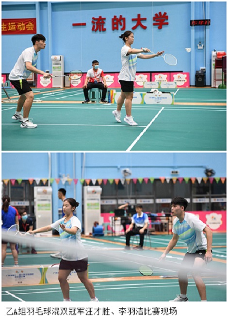 首次参加大赛的汪才胜和李羽洁两位队员在混合双打比赛中不惧对手,以2:1、2:0、2:1、2:0的比分战胜肇庆公司、广东二师、韶关公司以及广州体院的选手挺进决赛。其中,在与拥有夺冠实力的广州体院混双对打是他们在整个赛程中最为凶险和紧张的一场比赛,面对对手猛烈的攻势,他们坚决贯彻防守反击战术,积攒点滴优势,控制比赛节奏,一次次将比分扳平、反超,最终两局都以微弱的小分优势(22:20)领先,顺利拿下这场关键局。决赛与广东二师的选手展开冠军的争夺,在紧张的较量中,将比分定格在2:0,取得桂冠。赛后,汪才胜和李羽洁两位同学就此次赛事接受了广东广播电视台的采访。