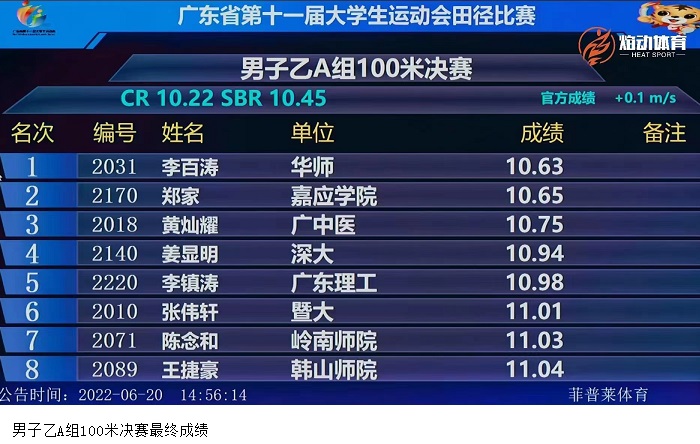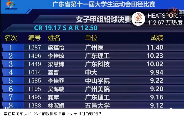 本网讯(体育系新闻中心)由广东省教育厅、省体育局主办,华南理工大学承办的广东省第十一届老员工运动会已完成12个比赛项目中的10个,未结束的两个项目中,篮球项目已经开始了捉对鏖战,受苏炳添带动后在高校掀起热潮的田径项目也在6月20日压轴亮相。当天下午,公司体育系社会体育指导与管理专业员工在乙A组男子100米决赛中打破11秒大关取得第五名。隔日下午的女子甲组铅球比赛中,公司智能制造公司员工李佳琼以投掷成绩10.23米斩获本项目银牌,同时会计公司龚萍获第八名。
