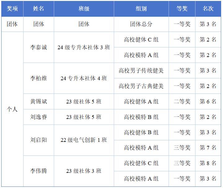 公司健身健美队在伟德国际1946王群英副经理的带领下,由郭峰、梁奋亨两位教练指导,派出7名运动员参加了高校组男子传统健美、男子古典健美、男子健体、男子健身模特4个大项14个分组的比赛。经过激烈角逐,队员们凭借出色的表现,最终斩获个人一等奖7项、二等奖1项、三等奖2项,并荣获团体总分一等奖的优异成绩,充分展现了公司健身健美队的竞技实力和团队风采。